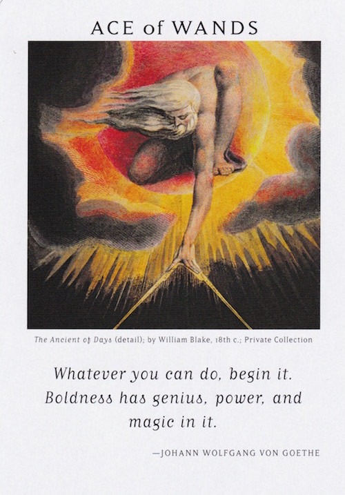 ・・・・・・・・・・・・・・・・・・・・・・・・・・・・・・・・・ The Ancient of Days by William Blake ウィリアム・ブレイク「日の老いたる者」 ワンドのエースらしいパワーのある絵ですね。 手に持っているのはコンパス。 コンパスでなにを描いているのでしょうか? そして言葉は Johann Wolfgang Von Goethe 誰かと思って調べたら、、、 ヨハン・ヴォルフガング・フォン・ゲーテ ドイツを代表する文豪 ゲーテでした。 英語読みだとウルフギャング、、、 そんな名前が付いていたんですね。 改めてお勉強になります。 ゲーテの言葉は深い。 夢を叶えるために、賢すぎたらダメで。 あれこれ考えず、やってみる。 勢いが大事ですよね。 昨日はタロットリーダー協会認定タロットリーダー勉強会だったのですが、 決めかねていることがあり、 占っていただいたところ、、、 3枚中2枚ワンドのカードがでました。 その案件についての課題はワンドペイジ逆「モチベーションが低い」 ではそれをどうすればいいかワンド8「勢いに乗れ」 カードのおっしゃる通りです(笑) 迷っているから決められない。 そういうときはカードを引くと一目瞭然です。 自分で引いたカードの責任は自分でとらないとね。 ということで期限がきたら、その案件を実行することにしてみます。 あなたにできること、夢見ていることがあれば、今すぐ始めなさい。 向こう見ずは天才であり、力であり、魔法です。 ゲーテ あーだこーだいわずやるしかない。 あなたもHAPPYな1日を!