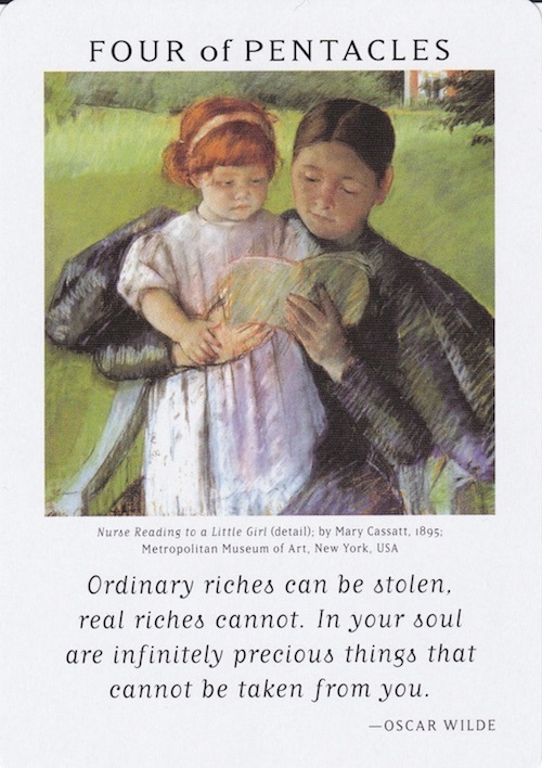 Nurse Reading To A Little Girl Mary Cassatt 1895 Metropolitan Museum of Art – New York, NY Ordinary riches can be stolen, real riches cannot. In your soul are infinitely precious things that cannot be taken from you. Oscar Wilde 普通の富は盗まれる。 本当の富は盗まれない。 あなたの魂の中にはだれも盗むことができない尊いものがある。 オスカー ワイルド 【カードの意味】 Legacy 継承 Inheritance 遺産 Personal values 個人の価値観