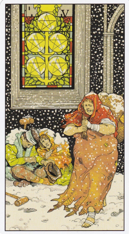 【カードの意味】 貧困 絶望 ボロボロの服を着た2人が雪の上に座っています。 ボロの束を持った太った女性が通り過ぎます。 彼女の手と足は包帯に巻かれ、 ボロボロのフカーフを巻いています。