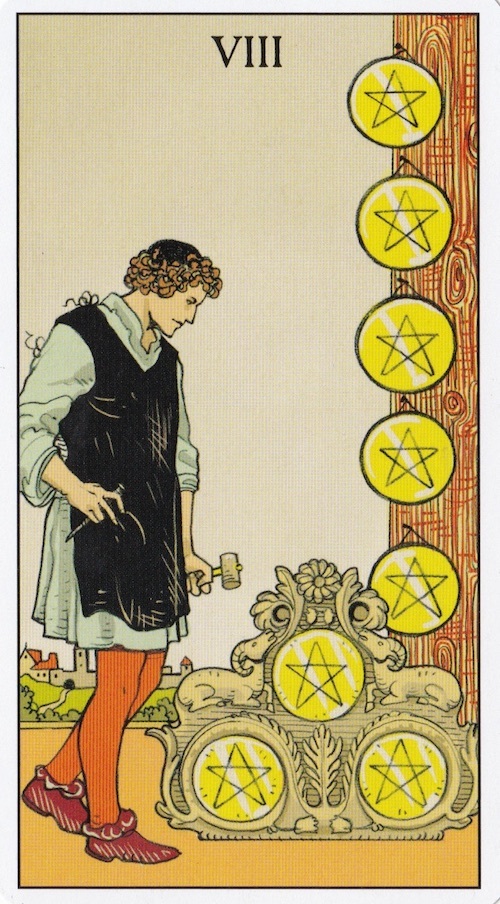 【カードの意味】 職人技 信頼 木工職人は、最後の仕上げをするために、 ハンマーとノミを持っています。 彼は3つのコインをあしらった、 羊と花と葉っぱの彫刻した作品を作りました。