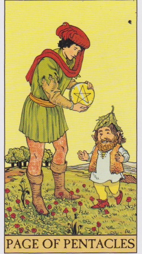 【カードの意味】 ペンタクルのペイジは地のエレメント。 彼の隣にはノーム(妖精)がいます。 ペンタクルは地のエネルギーと物質の世界を結びつけます。