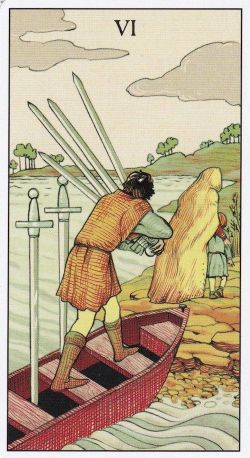 【カードの意味】 ある土地から別の土地へ。 嵐のような海を渡って、 新しい人生へ。 困難な生活から、平和な現実の世界への移行です。 女性と子どもは小さな船から降りて、 岩礁の海岸を越えていきます。