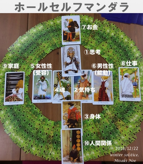 ・・・・・・・・・・・・・・・・・・・・・・・・・・・・・・・・・ 【季節のリーディング一覧】 2017冬至 2017秋分 2017夏至 2016冬至 2016夏至 2015冬至 2015夏至 まんなか6枚は自分の内面(INNER SELF) まわり4枚は自分の環境(WORLD)を表します。 ①思考(MENTAL)ソード ②感情(EMOTIONAL)カップ ③身体(PHYSICAL)コイン ④魂(SPIRIT)ワンド ⑤女性性〈受容〉(FEMININE) ⑥男性性〈能動〉(MASCULINE) ⑦お金(FINANCES) ⑧仕事(WORK) ⑨家庭(HOME) ⑩人間関係(RELATIONSHIPS) マンダラの意味を簡潔にご説明しますと、、、