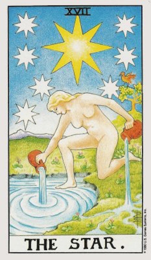 たたずむ裸の女性が描かれています。ふたつのカップから注がれる水は、