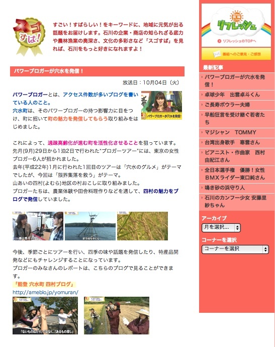 株式会社ファーレ 地方活性化プロジェクト長 みさき のゑです。 能登 穴水町 四村ブロガーPRツアー 【テレビ】 石川テレビ リフレッシュ