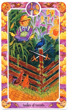 このカードは滞っていた心のエネルギーを進める アクティブで速いエネルギーのカードです。 そして良い選択と決定を助けます。 知的な力野心とゴールを意味します。 人は集中力を利用することを学び、 真実と明快さの究極のゴールへ導きます。 ソードのシーカーはオズの魔法使いの案山子(カカシ)が描かれています。 案山子はコミュニティと知恵と深い内なる理解を表します。 案山子は脳を手に入れるために、魔女の力が必要だと思っていました。 ドロシーに出会ったときに彼はこう言いました。 「私は痛くないから 手足や胴体がわらでつまっててもかまわない。 誰かがつま先を踏んでもピンをさしても 感じることができないだ。 でもバカと言われたくない。 頭はわらでできているけど、 わらの代わりに脳みそがあったら、 何を知ることができるかな?」 ドロシーたちと旅をしている彼は、 タロットのナイトのように強いイメージです。 案山子は探求します。 本当の力を求めるて、 いろいろな挑戦と障害をあえて受けて、 機転と常識を使って、精神的なギフトと 知性を理解します。 ソード探求者の問いかけ