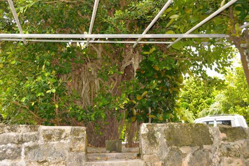 ガジュマルの根元に香炉が置かれています 木は女性の象徴なんだそうです。 いしき浜にてジャンプするのは玉樹奈和さん
